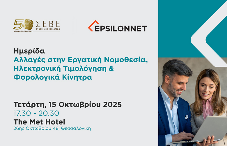 O Σύνδεσμος Εξαγωγέων - ΣΕΒΕ και ο Όμιλος EPSILONNET με σκοπό την άμεση και υπεύθυνη ενημέρωσή σας σχετικά με όλες τις πρόσφατες εξελίξεις στην εργατική & φορολογική νομοθεσία, διοργανώνουν διά ζώσης ημερίδα με θέμα: